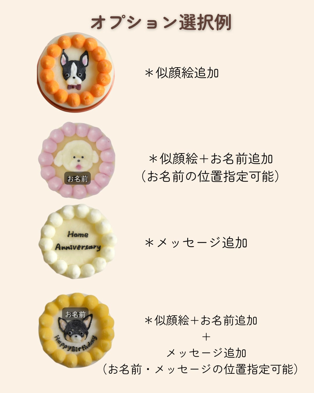 ケーキが小さいのでわんちゃんの似顔絵は1つのケーキに1わんちゃんとさせていただきます。
